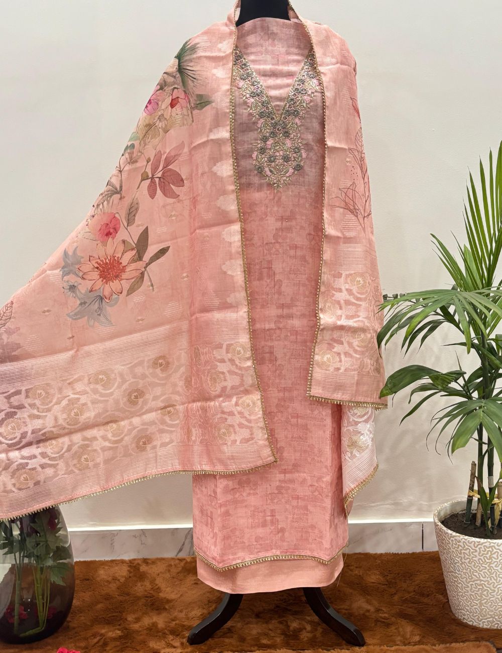 Step into timeless elegance with this exquisite peach pink Indian ethnic suit set — a perfect blend of tradition and sophistication. The outfit features a beautifully hand-embroidered neckline with intricate floral detailing that adds a regal touch.